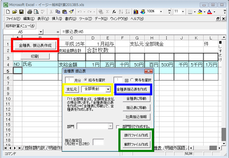 B、黄枠の「支払元」で支払元を選び、青枠の「金種表振込表作成」ボタンで、振込表・金種表を作成します。