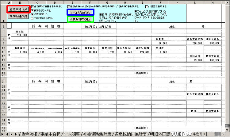 ■「健康保険と厚生年金のコピーと、雇用保険と所得税の計算」ボタンは、上の2つを、順次に行います。