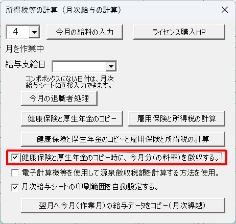 また、当月分の健康保険を徴収している場合、「健康保険と厚生年金のコピー」を押す前に、「健康保険と厚生年金のコピー時に今月分(の料率)で徴収する」のチェックボックスにチェックすれば、作業月4月でも4月分の健康保険(子育て支援金が加算)料率が適用されて再計算された金額が、月次給与シートの「健康保険」項目に貼り付けられます。