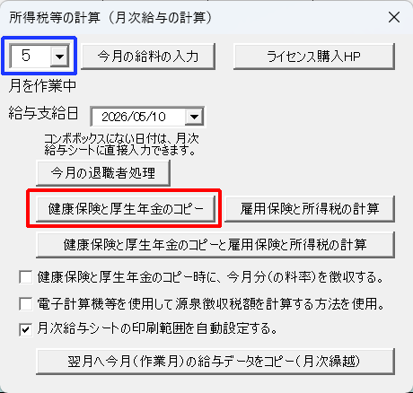 イージー給料計算では、通常前月分の健康保険を徴収するので、作業月5月の給料計算時に「健康保険と厚生年金のコピー」ボタンを押すと、4月分の健康保険(子育て支援金が加算)の料率で再計算された金額が、月次給与シートの「健康保険」項目に貼り付けられます。