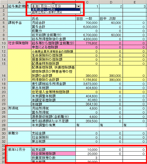 「前年12月分〜本年11月分」に設定した場合、前年の12月分は、ここに入力された金額が、源泉税集計表と年末調整に使われます。