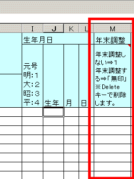 で、源泉徴収票を出力する場合は、社員情報シートのM列、「年末調整」の該当人の部分に、「1」を入力して、「年末調整をしない」設定にします。